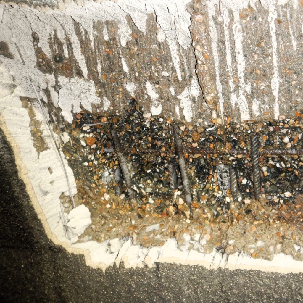Our approach: Making the invisible visible Through a thorough research campaign—consisting of visual inspections, extensive concrete cover measurements, and laboratory analyses of concrete cores—SANACON accurately mapped the current condition of the tunnel structure . Our research focused specifically on the remaining service life and the risk of reinforcement corrosion due to carbonation and chlorides .
